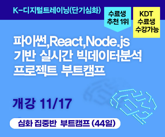 프로그래밍&빅데이터 조O환6개월 - 개발회사 다니다 심화과정 듣게 됬는데 짧은기간동안 수업과 팀프로젝트를 진행하며 듣게 되었는데,시간이 많이 부족했지만 팀원 전체가 힘을 합쳐 모두 함께 회의 부터 기능개발까지 많은 노력을 하여 최종적으로 좋은 결과물을 제출할 수 있어서 매우 많은것을 배울 수 있었고 뜻깊은 2개월이였습니다.
