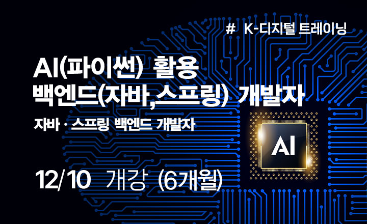 | 교육과정 | AI(파이썬) 활용 백엔드(자바, 스프링) 개발자 | 교육일정 | 주간 09:00 ~ 17:40 |